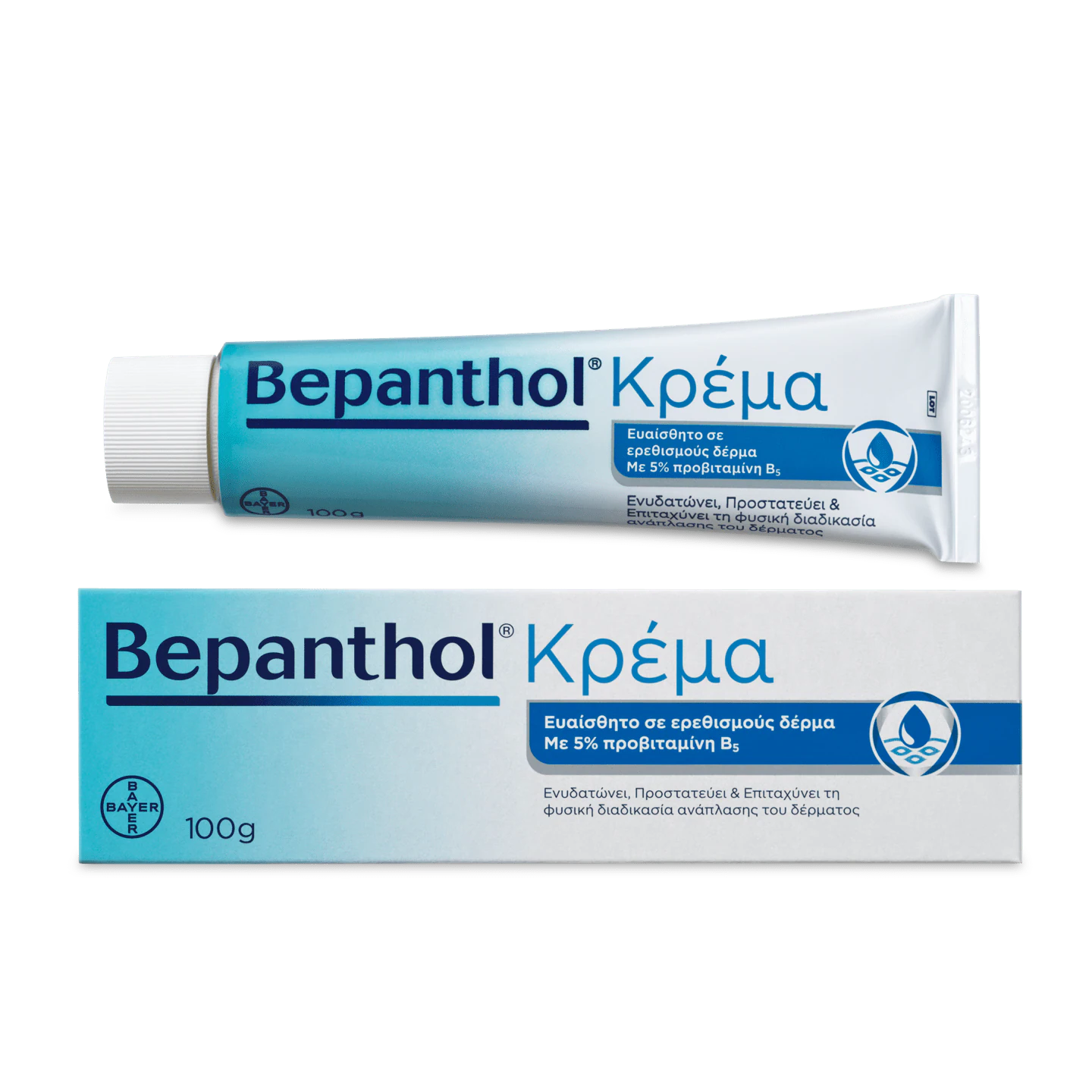 Ενυδατώνει, Προστατεύει & Επιταχύνει τη φυσική διαδικασία ανάπλασης του δέρματος. Η Bepanthol® Κρέμα περιέχει 5% προβιταμίνη Β5 και περιποιείται αποτελεσματικά το ξηρό και το ευαίσθητο σε ερεθισμούς δέρμα