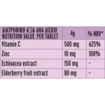 Συμπλήρωμα διατροφής. Αναβράζοντα δισκία με γεύση φρούτα του δάσους. Συμβάλλει στην ενίσχυση του ανοσοποιητικού συστήματος, προσφέρει αντιοξειδωτική δράση και ενέργεια και βοηθάει στην αντιμετώπιση του κοινού κρυολογήματος. Χωρίς προσθήκη ζάχαρης, χωρίς λακτόζη, χωρίς γλουτένη